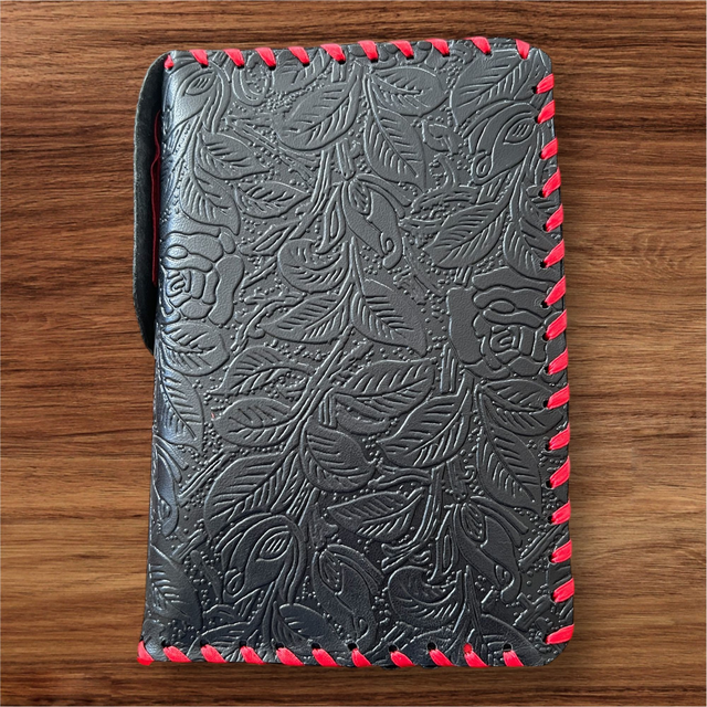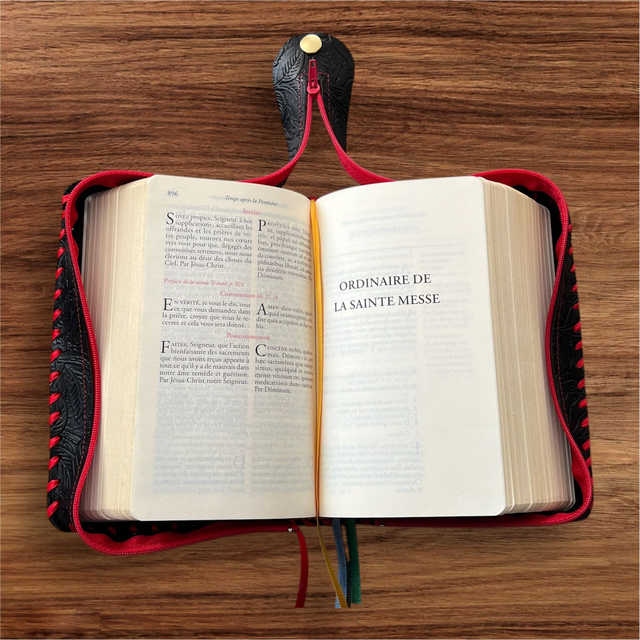 Custode en cuir imprimé floral noir avec ruban et fermeture éclair rouges et pression dorée. Convient pour Missel quotidien des fidèles de l'abbé Daniel Joly aux éditions Clovis (2022).